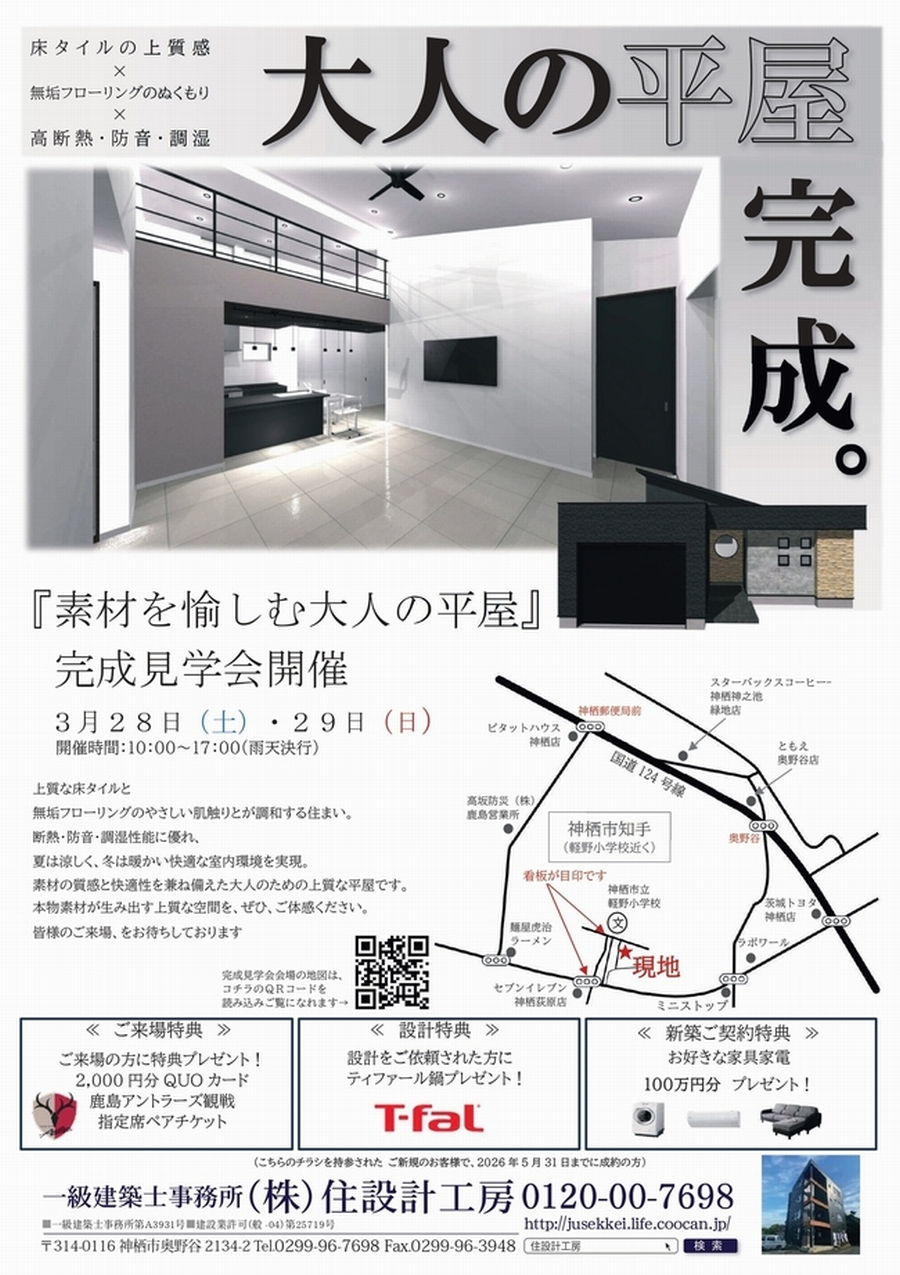 2026年3月28日(土)~2026年3月29日(日) お客様のご厚意により、完成見学会を開催させていただきます。 お気軽にお立ち寄りください。